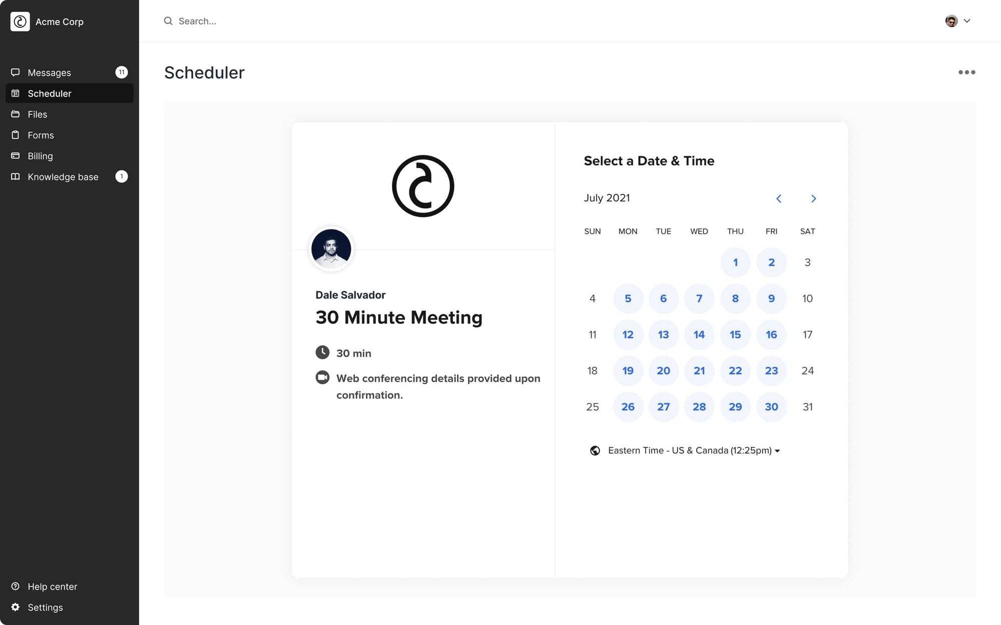 If customers require extra clarification or information, they may book a meeting using a tool like Calendly right in the client collaboration portal. Assembly allows you to add the Calendly extension to your client portal, so it’s easy for customers to schedule time with you.