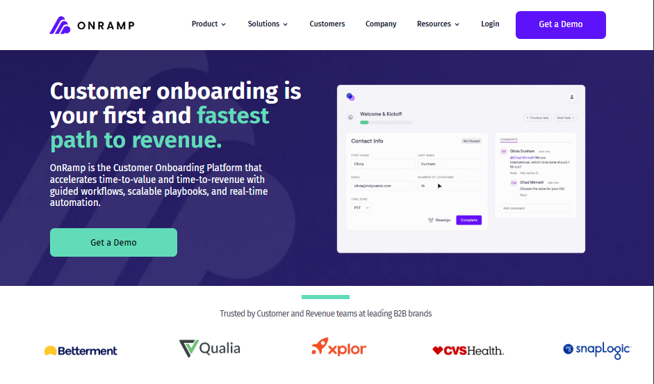 - What it does: OnRamp helps SaaS companies and service teams guide clients through complex implementation steps. It provides templates, progress tracking, and dashboards to monitor onboarding milestones.