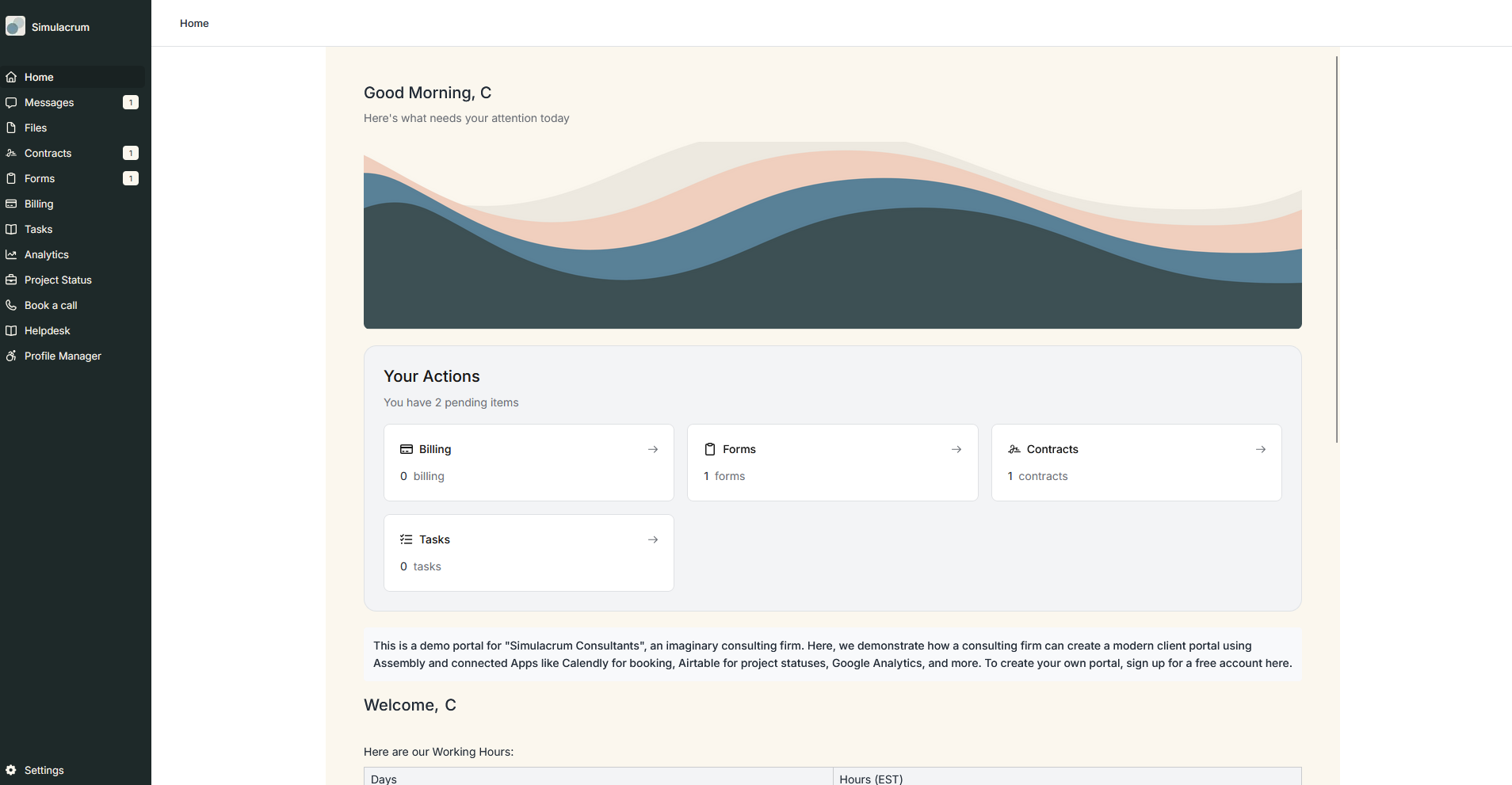 Many of the best client portal examples run on a platform that supports the full client relationship in one place. Assembly is built for that.