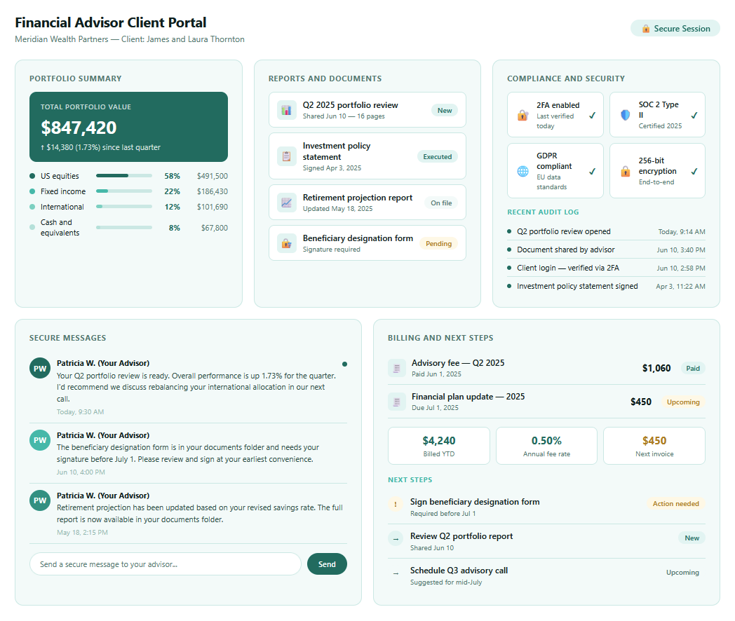 Financial advisors handle some of the most sensitive information a client will ever share, and the way that information gets exchanged matters. A portal gives advisors a secure channel to share reports, documents, and billing information with each client.