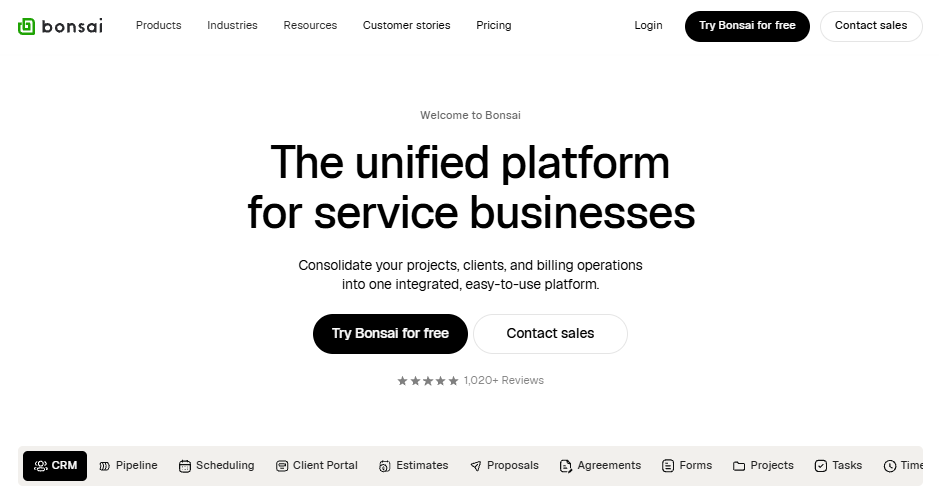 - What it does: Bonsai combines CRM, contracts, proposals, and billing into one platform. It helps small teams handle client work and payments without juggling tools.