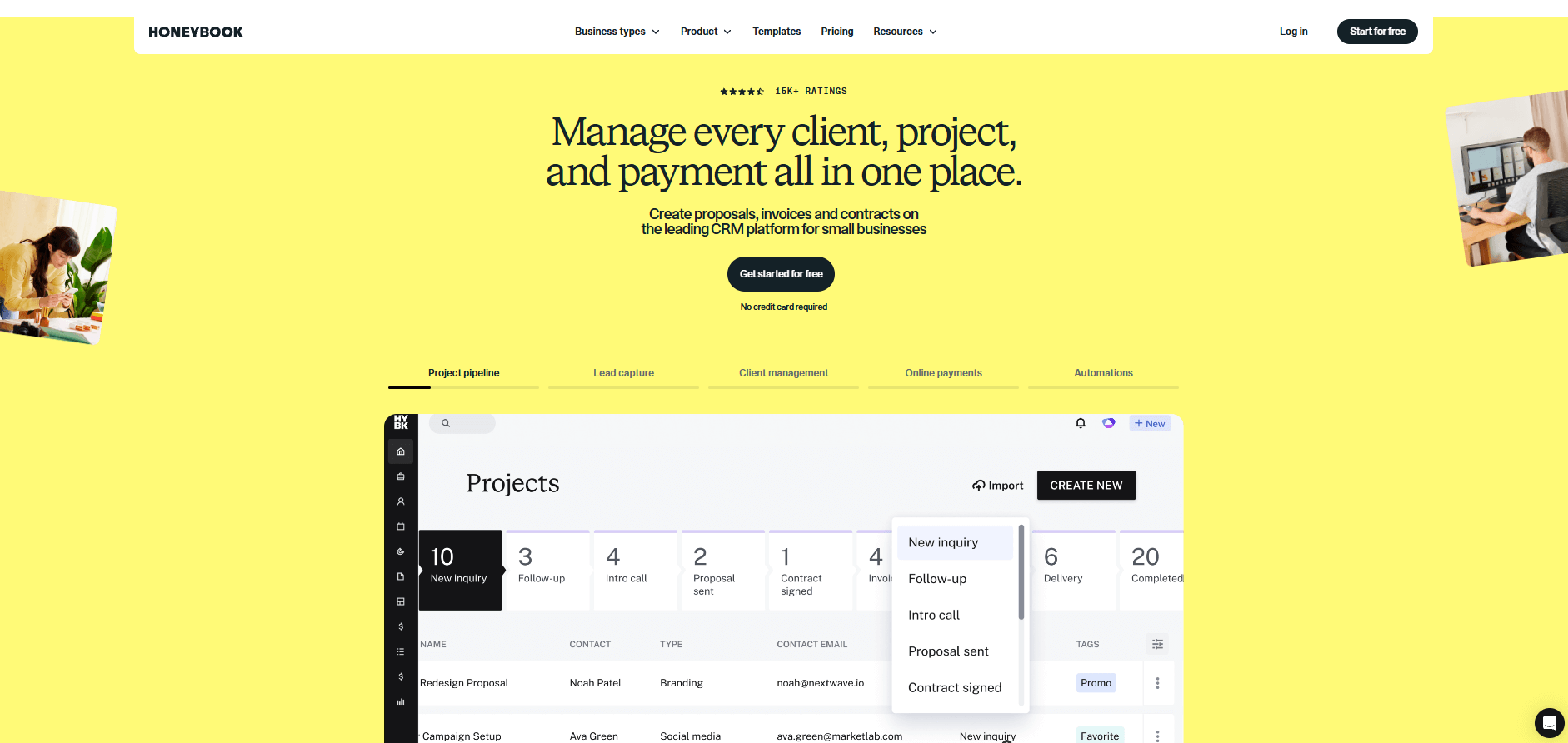 HoneyBook focuses on freelancers and creative professionals who want a polished way to book clients and get paid. The platform handles proposals, contracts, and invoicing in one flow, so clients can review terms and submit payment without jumping between tools.