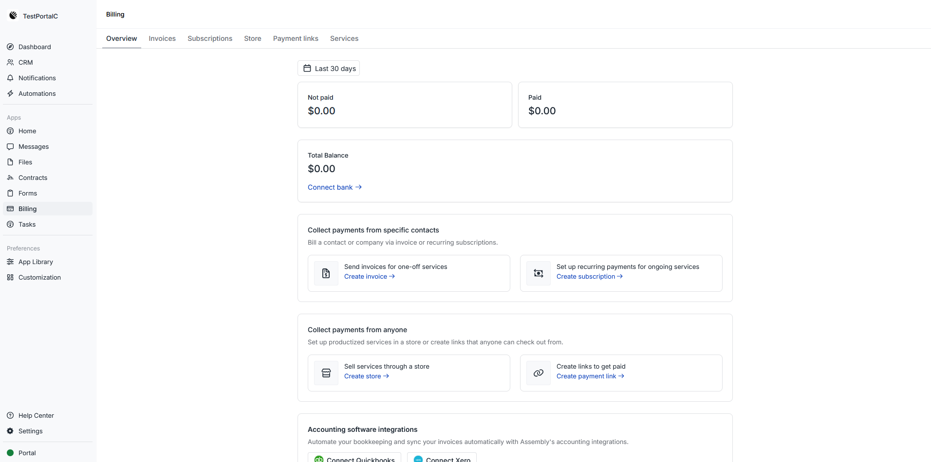 To set up billing, click the Billing link on your sidebar. You can also add a payment method, create a subscription, or send an invoice directly to your client.