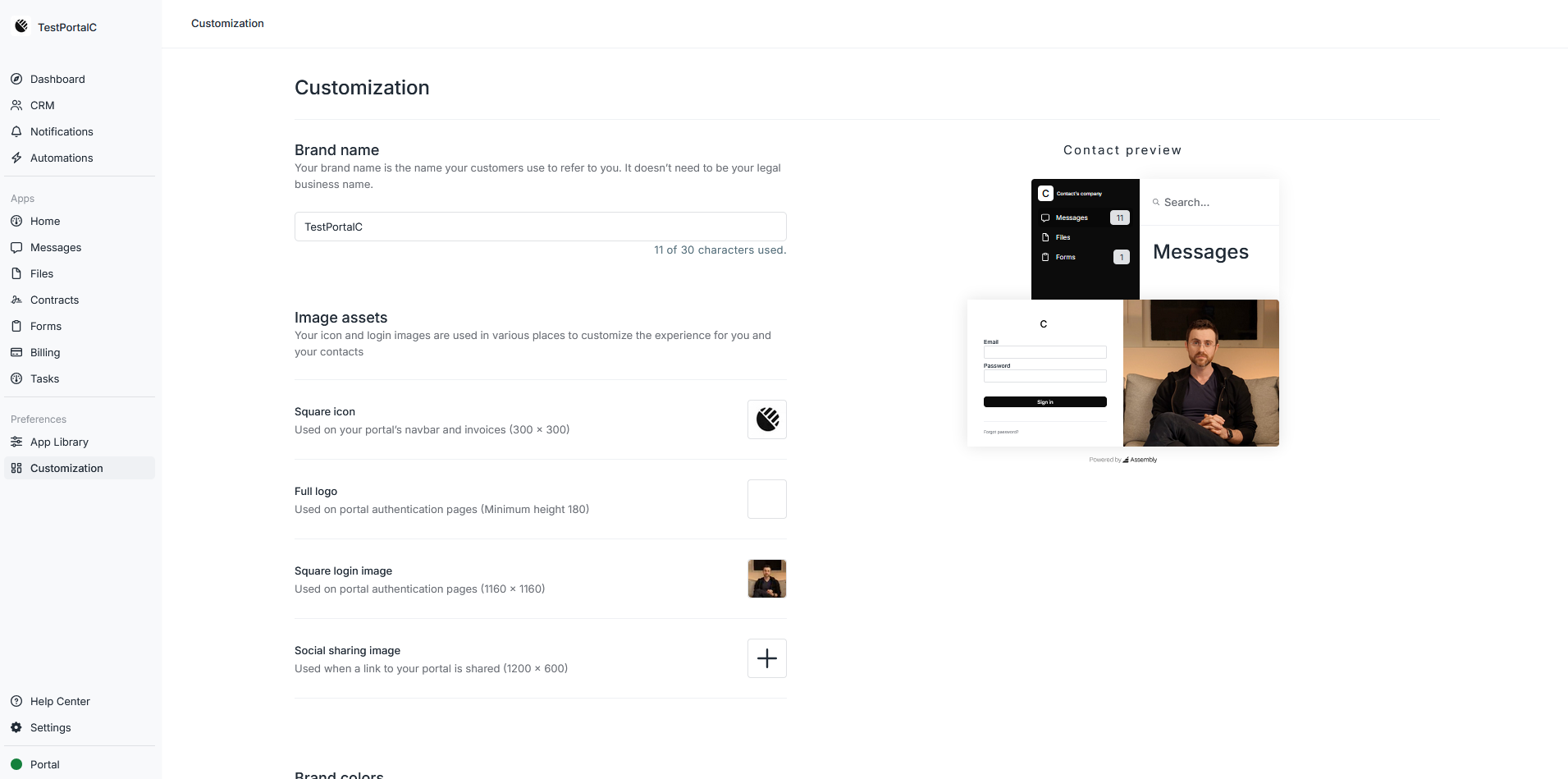 Once you’ve logged into Assembly, click on Customization (under preferences on the sidebar) to set up your branding. Upload your logo, set your brand colors, and choose a font that matches your website.