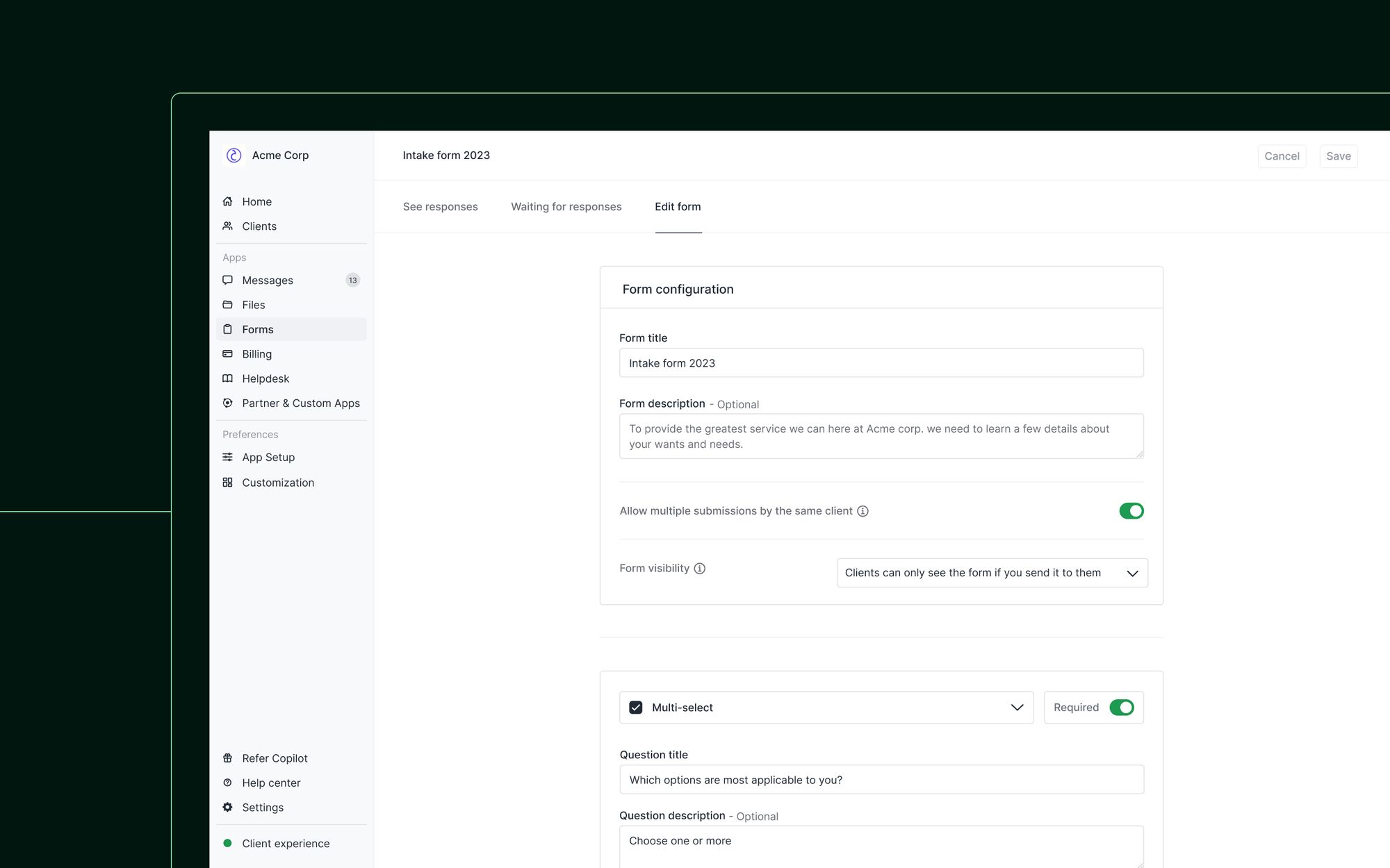 We’ve redesigned the Forms App for both internal and client users. For internal users, when you click into a form you’re now greeted with a more intuitive experience that separates form responses, form requests (i.e. to see who has been assigned a form and has not yet responded), and the form edit experience. We’ve also redesigned the form editor from scratch. For client users, the form submission experience has also been redesigned to be more seamless on desktop and mobile.