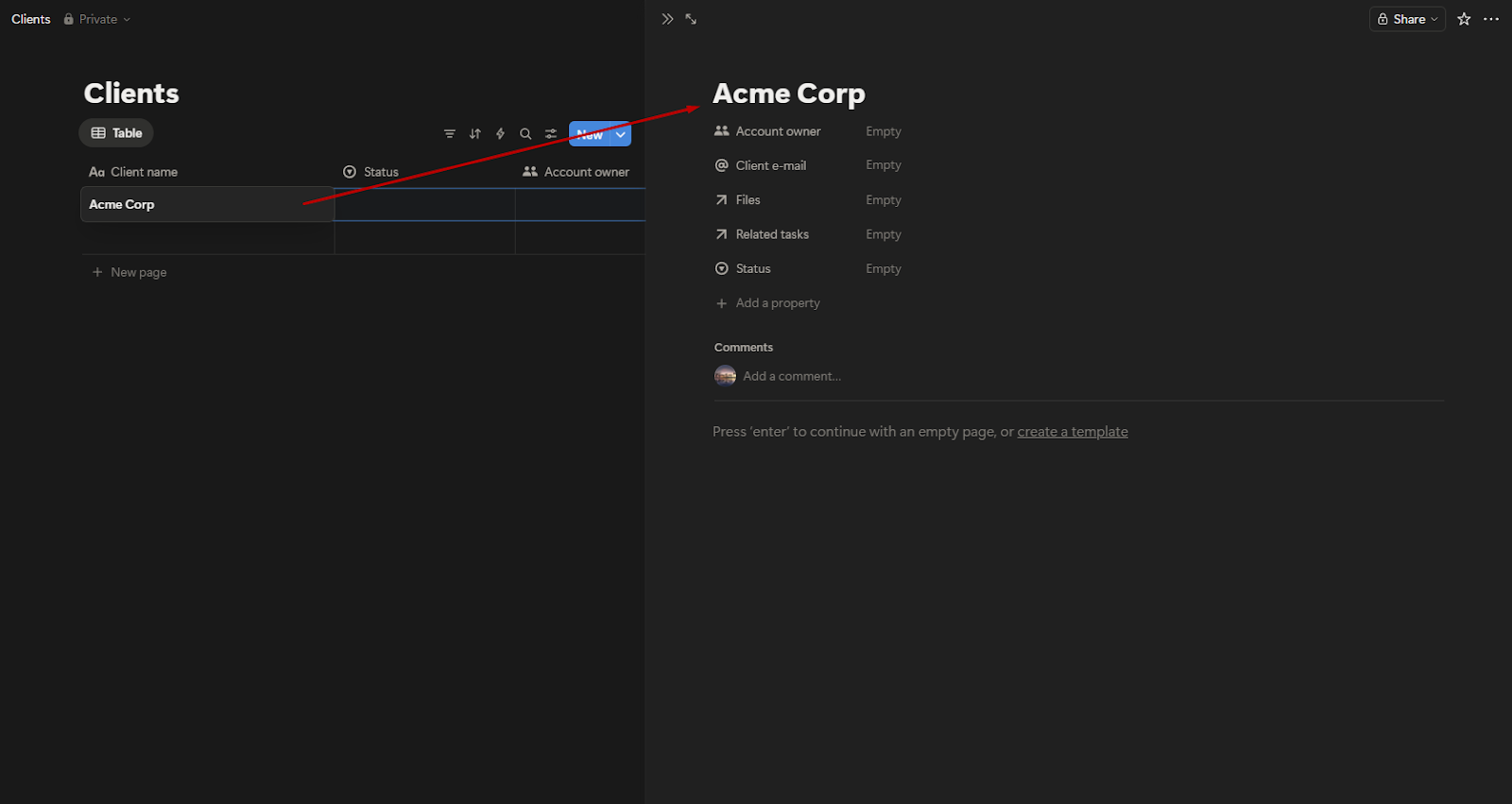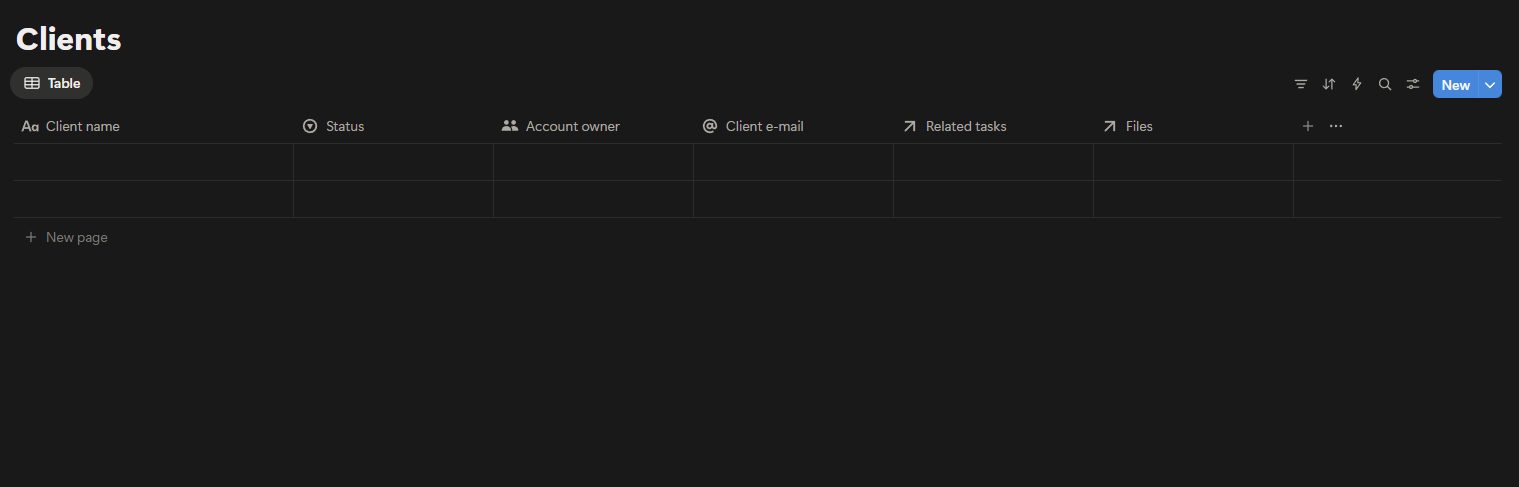 This creates a database that will store one row per client. Each row also functions as a page, and that page becomes the client’s portal.