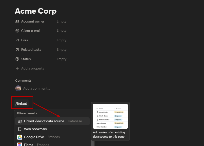 Inside the page, type /linked and select Create linked view of database. Choose your Tasks database.
