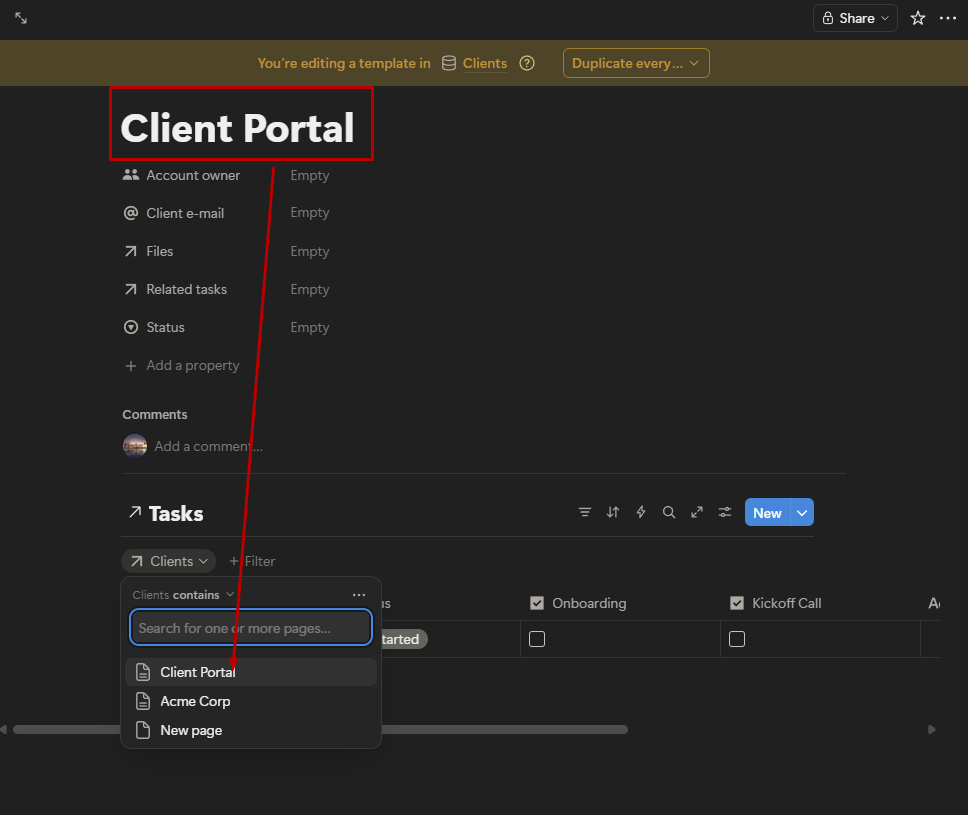 Select the Clients relation property. In the value field, choose the Client Portal page itself. When you create a new client using this template, Notion automatically updates that reference to the new client’s page.