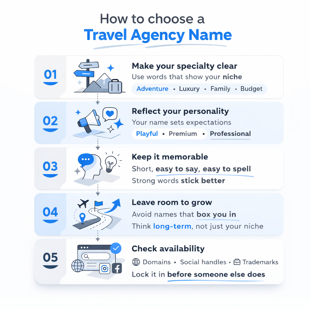 A good travel agency name does 3 things. It tells people what you do, sticks in their memory, and gives your business room to grow. Here's what to think about before you choose: