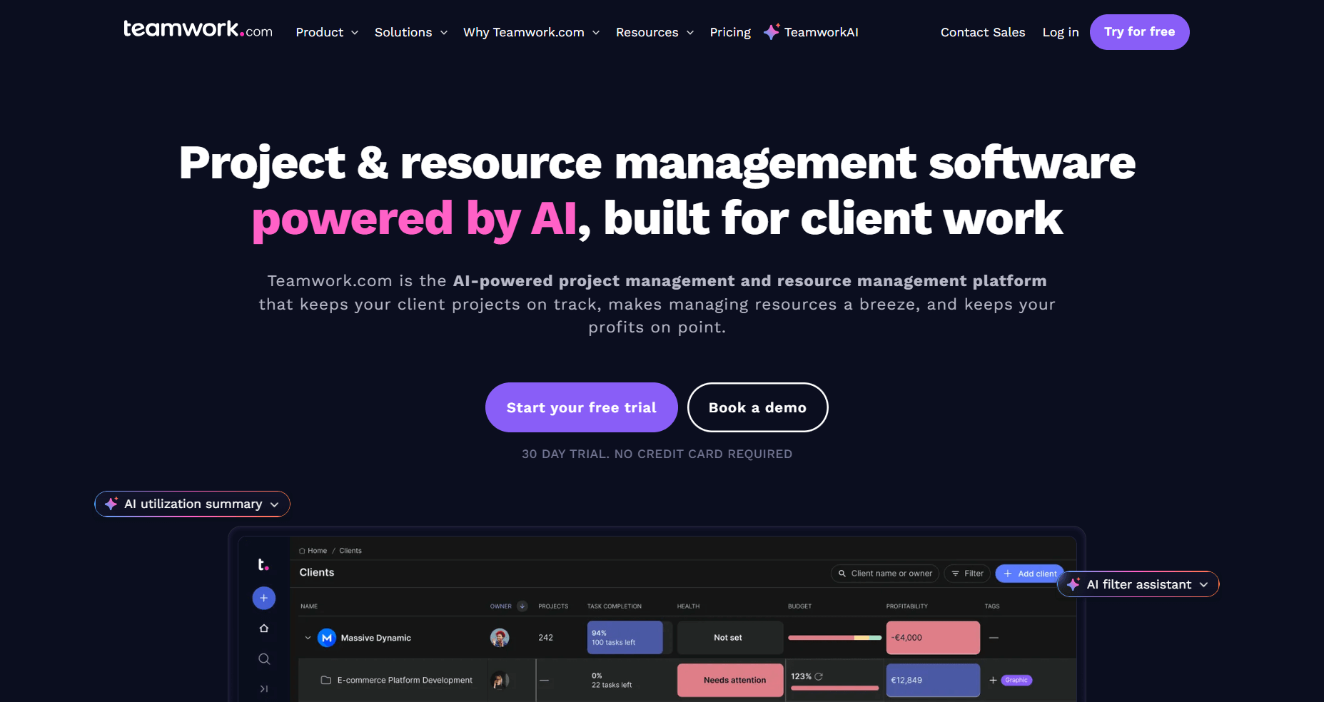 - What it does: Teamwork.com is a project management platform built for client work. It combines task management, time tracking, resource planning, and invoicing in one system designed for agencies and professional service teams.