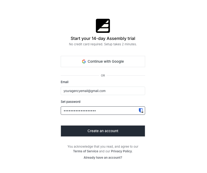 Sign up for an Assembly account and complete your workspace setup.