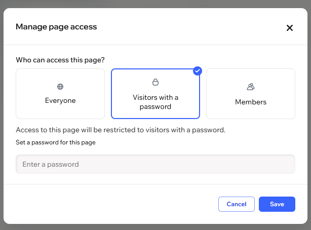 In the Manage page access panel, click on Visitors with a password.