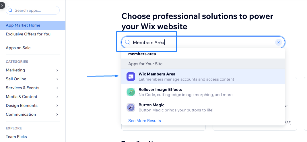 In the App Market, search for "Members Area" and select Wix Members Area.