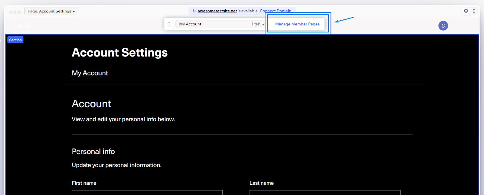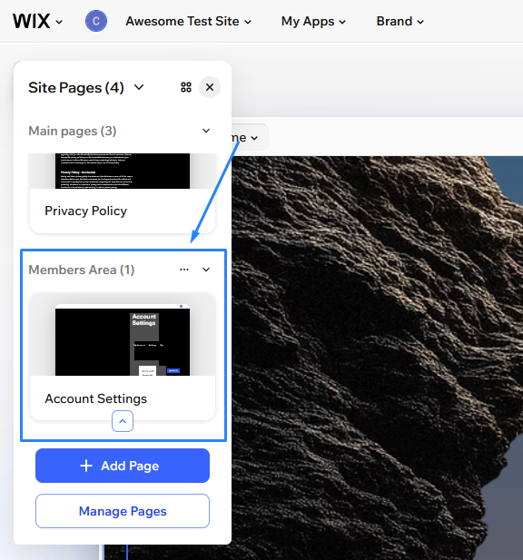 To manage which member pages appear on your site, navigate to one of the Members Area pages, like Account Settings.