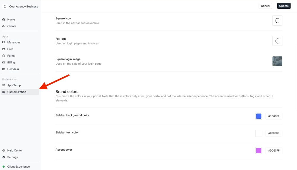 Once you’re logged into your dashboard, navigate to Customization on the left side menu. Add your company name, logo, brand colors, and custom domain if you want clients to log in through a branded URL. This becomes the client-facing workspace where all communication and documents live.