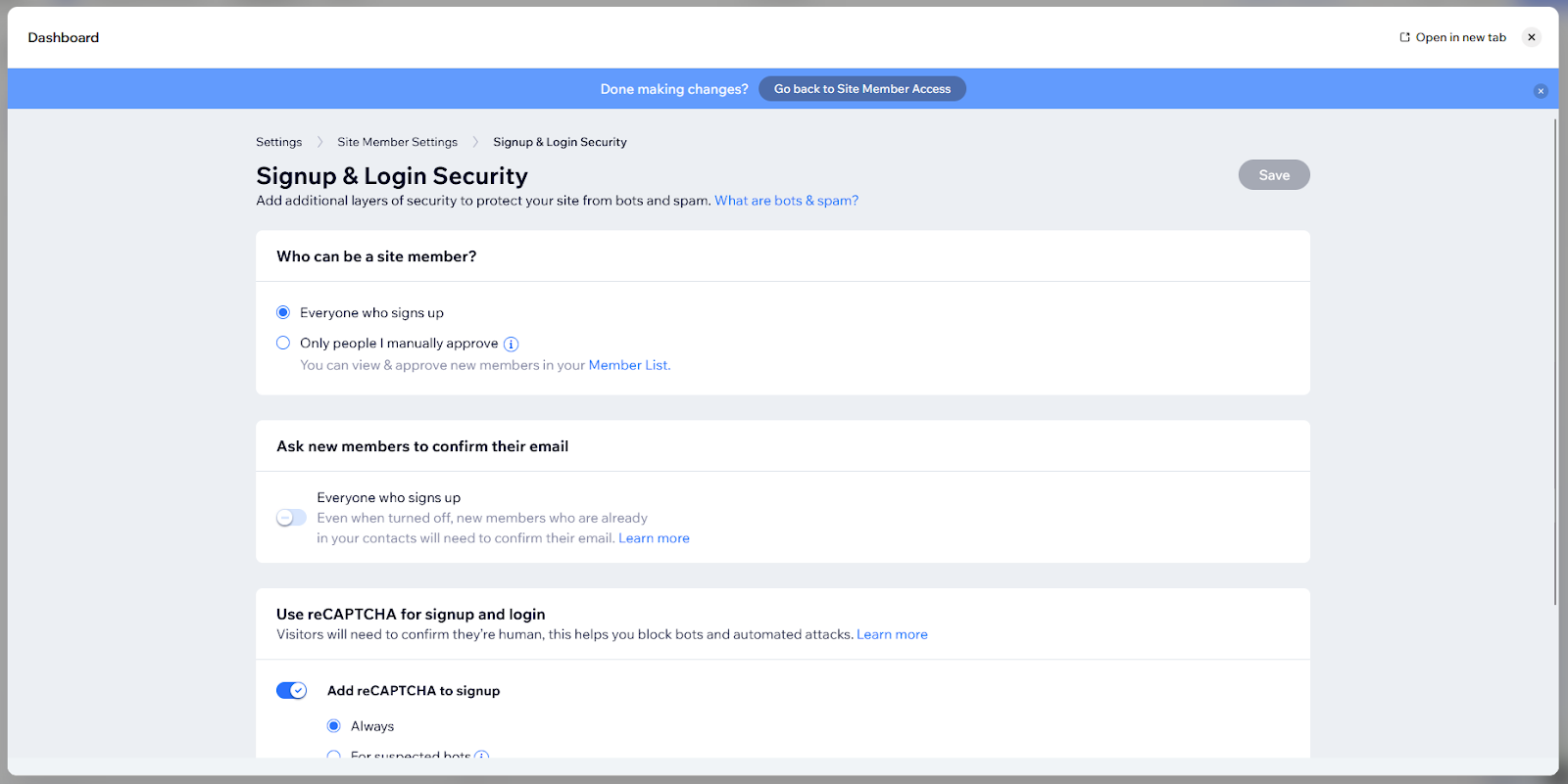 On the Signup & Login Security page, you can choose whether anyone can sign up freely or whether signups require your approval.