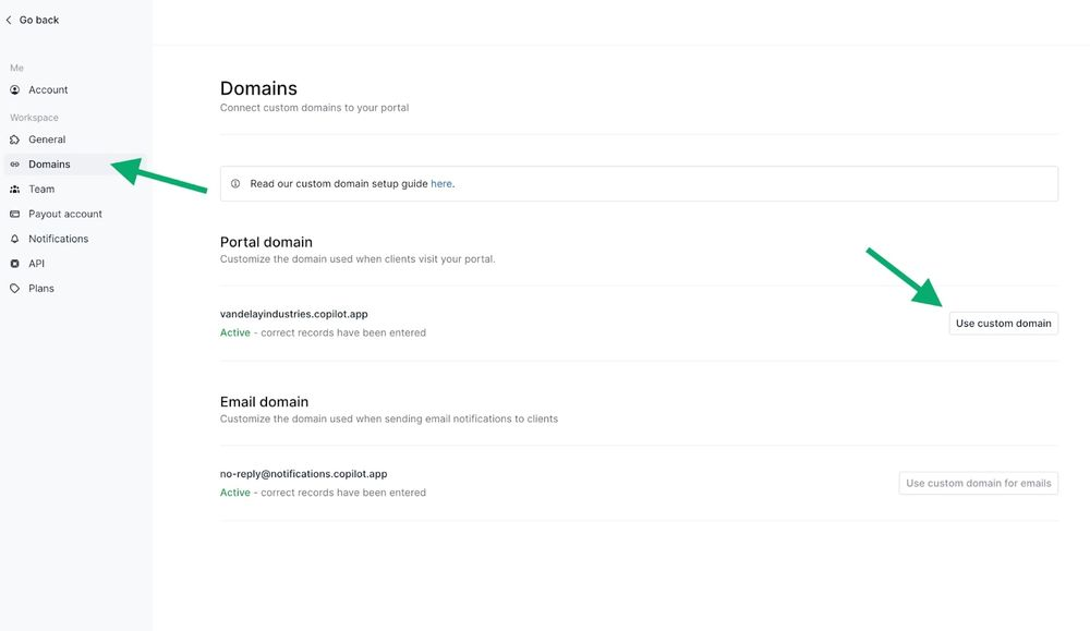 Once you’ve customized your client portal, head to Settings and select the Domains tab. This section controls the URL clients use to access their portal.