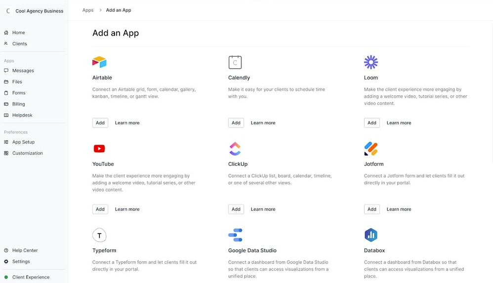 Here, you can choose to add apps for billing, tasks, messaging, and file management. You can also see all the services that Assembly integrates with, such as Airtable and Calendly.