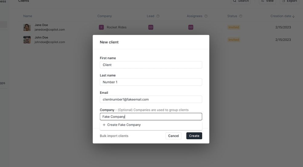 Create a new record for each client, or click on Bulk import to upload many at once.