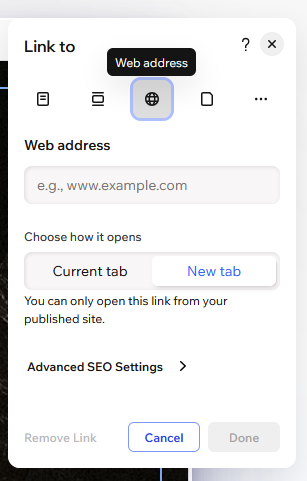 In the Link section, click on the globe icon to input a web address.