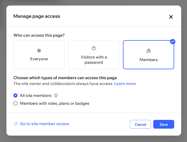 Change the page access from everyone to Members only. If you're using roles or plans, select which specific role or plan should access this page.