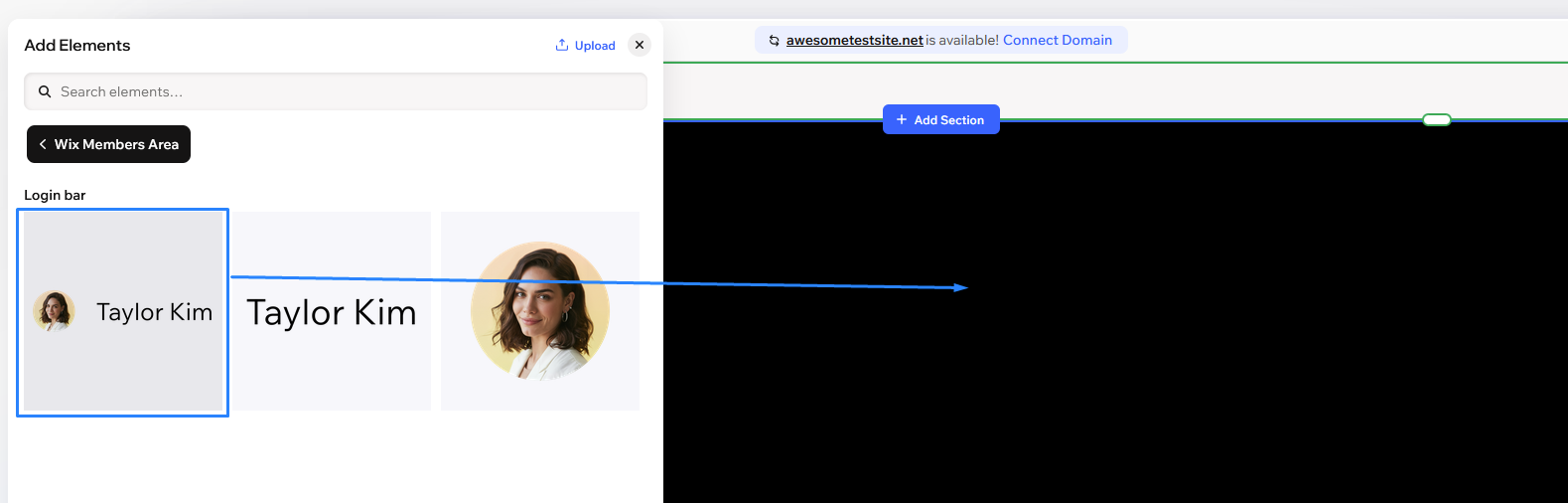 Click the + Add button on the top left of the screen, then navigate to the Wix Members Area section.