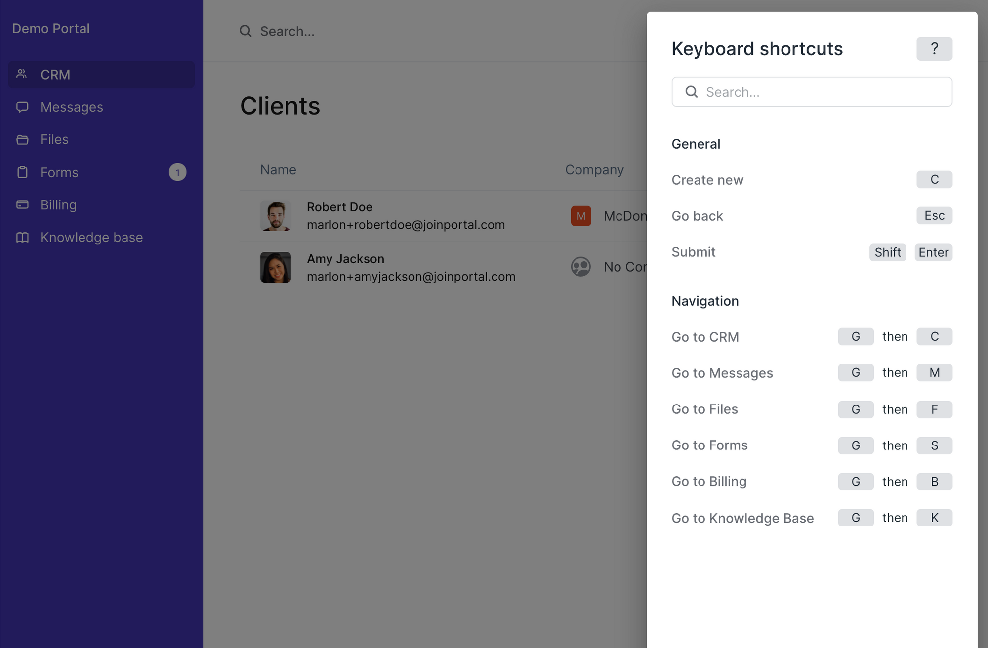 This is release includes our initial set of keyboard shortcuts. They let you control all of the common functionality of Portal and makes the application much faster to use. You can press ? to bring up the shortcuts window, or you can click on the Help center section at the bottom of your sidebar and then select Keyboard shortcuts. We're going to continue to improve the shortcuts interface, so if you have any requests please let us know.
