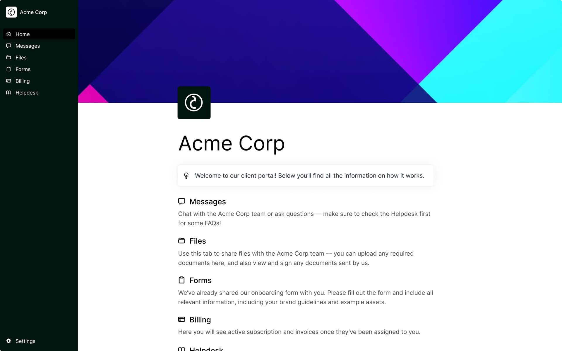 Create intuitive and personalized home pages. Whether it be welcoming clients, giving them directions, or assigning tasks— a home page can start providing a frictionless experience the moment clients log in.