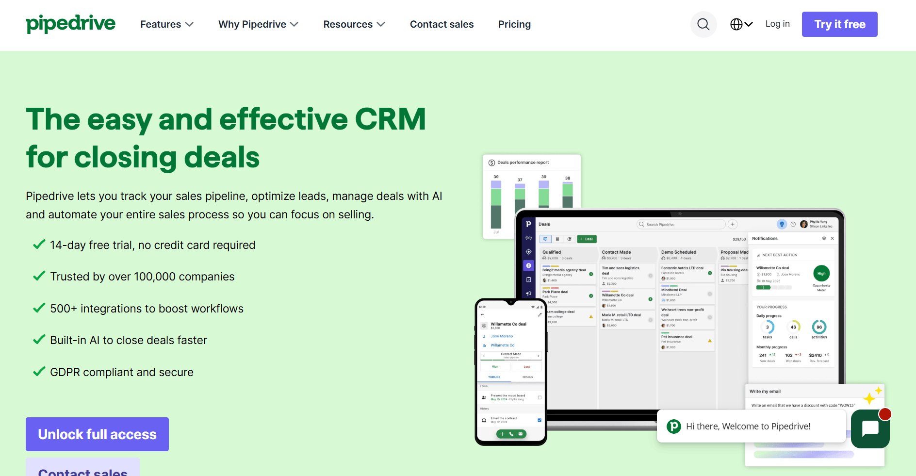 - What it does: Pipedrive is a sales-focused CRM built around visual deal pipelines. It provides customizable stages, activity tracking, sales reporting, and automation for follow-ups. You can manage deals by moving them across a board-style pipeline.